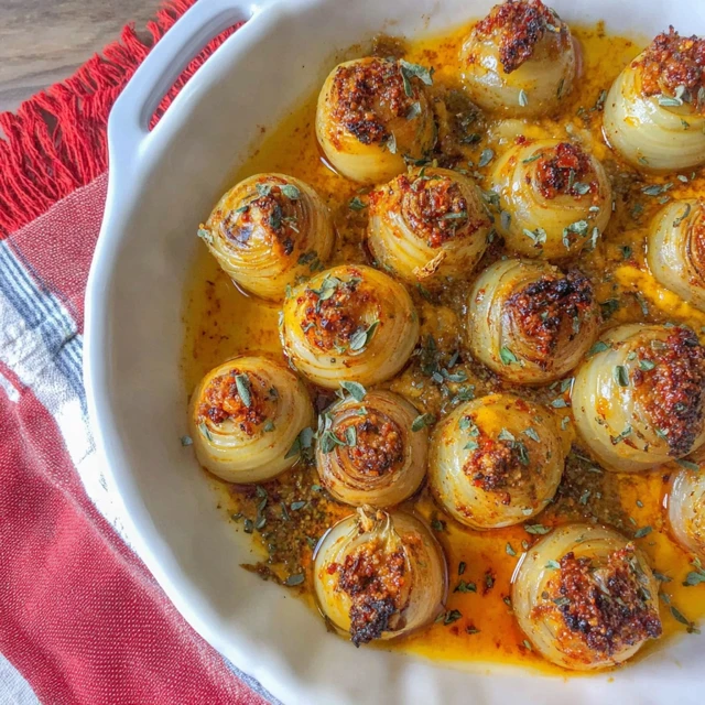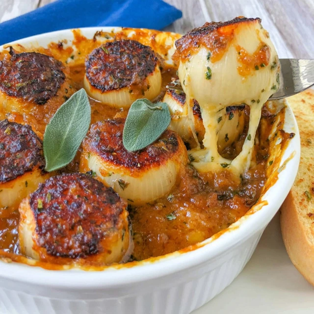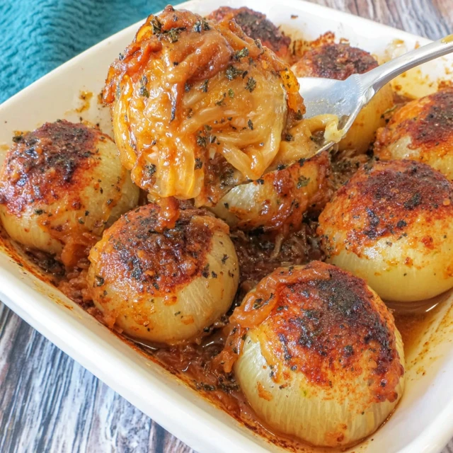 Bake for 45-50 minutes until bubbly and golden brown on top, with the onions tender when pierced