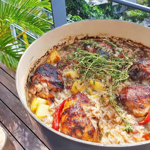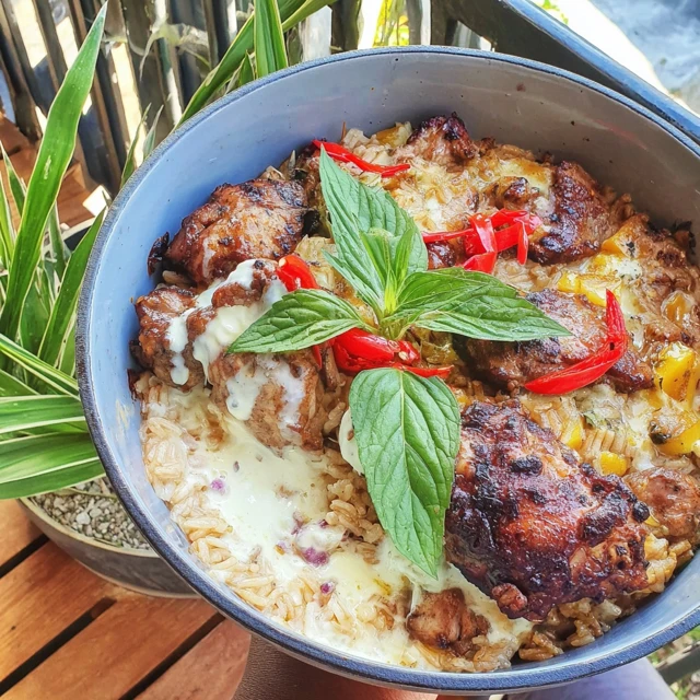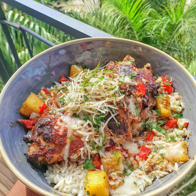 Indulge in the vibrant flavours of Jamaica with this mouthwatering Jamaican Jerk Chicken and Mango Bake served alongside creamy Coconut Rice.