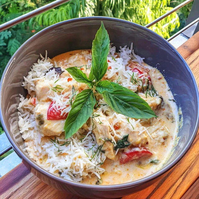 Serve the coconut curry chicken over jasmine rice, garnished with fresh coriander and lime wedges.
